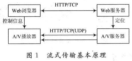 需要說明的是,在流式傳輸中,使用RTP/UDP和RTSP/TCP兩種不同的通信協議與A/V服務器建立聯系,是為了能夠把服務器的輸出重定向到一個不同于運行A/VHelper程序所在客戶機的目的地址。實現流式傳輸一般都需要專用服務器和播放器,其基本原理如圖1所示。