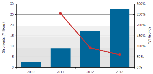 隨著主要電視品牌廠商開(kāi)始在商場(chǎng)銷售3D電視及有愈來(lái)愈多關(guān)于3D產(chǎn)品計(jì)劃的進(jìn)行,DisplaySearch將2010年3D電視出貨量提高到250萬(wàn)臺(tái),同時(shí)3年后3D電視市場(chǎng)將會(huì)有非常驚人的發(fā)展,預(yù)估到2013年將超過(guò)2千7百萬(wàn)臺(tái)出貨。圖一為2010到2013年間3D電視出貨量預(yù)測(cè)。