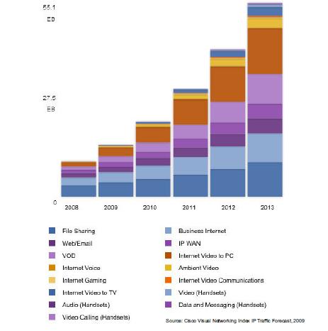 如圖1所示,從2007年到2012年,IP總流量將增加6倍,幾乎每兩年就翻倍。2012年之前,流量每年增長522exabytes(1018,即zettabyte的一半)。這種指數增長的主要推動力量是高清晰視頻和高速寬帶消費類應用。
