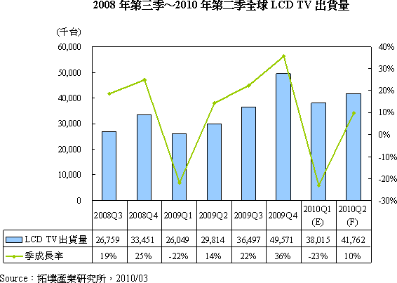 每年第一季歐美地區(qū)普遍缺乏節(jié)日刺激銷售,因此當季全球LCD TV出貨量往往呈現(xiàn)衰退狀況。雖然業(yè)界期望中國春節(jié)能改變第一季衰退的命運,但2010年春節(jié)中國市場LCD TV銷售量僅214萬臺,遠低于各界預估的400萬臺。拓墣產業(yè)研究所張乘維經(jīng)理估計,2010年全球LCD TV首季出貨量僅3,802萬臺,較2009年第四季下滑23%。