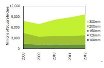 全球硅片市場按出貨面積計, 在2009年下降11%, 而在2010年有望達到82億百萬平方英寸, 增長17%。其中300mm硅片增長最快為27%,達45億百萬平方英寸(MSI), 相比較200mm硅片增長7%及150mm硅片在10%以下。