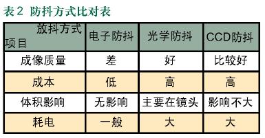 鏡頭防抖是通過鏡片的移動來補償相機的抖動,它由傳感器,微處理器,補償鏡片控制組,驅動控制部分組成,依靠補償鏡片的移動來校正手抖引起的光線偏移,如圖1,鏡頭不同,設計上有差異,但基本上都是透過補償鏡片組來補償。CCD防抖是通過感光元器件CCD(或CMOS)放在一個可移動支架上來,通過傳感器感知相機的抖動,由微處理器計算相應的移動量,由驅動部分對CCD移動,以達到防抖目的。目前,一般相機的防抖(CCD防抖或光學防抖)不是無限可以補償,一般為2~~3級,按表一來說,假設安全快門1/125,2級,快門速度1/30,快于此速度,容易拍清晰的照片,由此類推,3級,快門速度為1/15。表2為三種防抖方式的比對表。