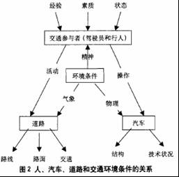 汽車道路交通事故是世界性的災(zāi)害,因此汽車交通安全也是世界性的難題。道路交通事故引起人的傷亡,財(cái)產(chǎn)的損失,給國(guó)民經(jīng)濟(jì)也帶來了巨大的損失。然而誘發(fā)交通事故的因素是多方面的,它受汽車行車速度、道路條件、車輛狀況、駕駛員行為、駕駛員的文化素質(zhì)和自然環(huán)境等因素的綜合影響。其中人、汽車、道路、環(huán)境條件是影響道路交通安全的主要因素,它們之間的關(guān)系見圖2。