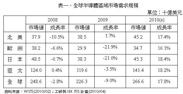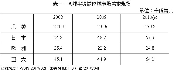 2009年全球半導體市場僅北美地區微幅成長1.7%,其他皆呈現負成長:亞太市場衰退3.5%,歐洲市場衰退21.9%,日本市場衰退21.0%。不景氣使得下游電子產品品牌大廠,如Dell、HP、Sony等廠商增加產品委外代工之比例,以降低生產成本,增加其產品競爭力。因此,2009年主要從事代工生產之亞太地區,才會出現僅小幅衰退之情形。至于北美地區則是因為受到下游品牌廠商降價促銷成功,使得市場呈現小幅成長。