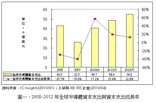 金融風暴使得全球廠商皆大幅減少資本支出金額,以保存手中之現金,度過此波不景氣。 2009年全球半導體資本支出為259億美元,較2008年429億衰退39.6%。然而,在看好今年歐美主要消費市場需求之復蘇,以及新興市場需求力道可望持續下,2010年全球半導體廠商將提高資本支出達407億美元規模,較2009年大幅成長57.1%。其中,全球記憶體廠商大幅提高資本支出,以提升其先進制程水準,是主要動力之一。