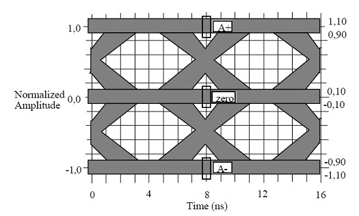 本次測試將主要驗證產(chǎn)品上4個以太網(wǎng)100Base-TX接口的技術(shù)指標(biāo)。對于其中比較直觀的100Base-TX物理層的眼圖模板,《ANSI+X3_263-1995》標(biāo)準(zhǔn)中有著明確的眼圖模板定義見圖2。