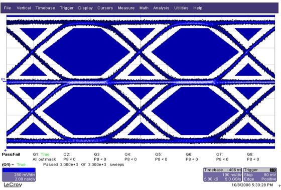 經(jīng)過研發(fā)與測試工程師的討論,在目前不改動系統(tǒng)設(shè)計的前提下,采用微調(diào)RDAC電阻的方法來增大信號輸出電平幅度以解決信號眼圖的問題。經(jīng)過調(diào)整后,眼圖測試通過,波形見圖6。