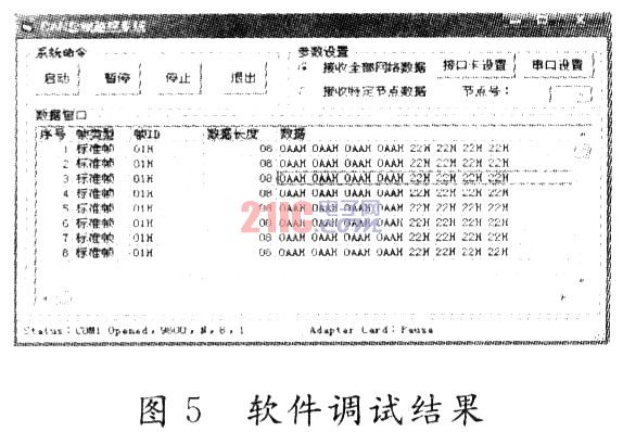 命令幀共6個字節,傳輸方向為PC機到單片機。以0X00H作為幀起始,數據長度為2,當數據1和數據2同為0X00時,表示啟動接口卡,單片機接收到該信號后.會初始化SJA1000,并將結果反饋給PC機(成功或失敗);當數據1和數據2同為0XFFH時,表示要求接口卡停止工作,單片機會讓SJA1000進入睡眠模式,以退出總線;當數據1為0X01H時,表示PC機要求只接收某個節點的數據,數據2則表示該接點的節點號,單片機會重新設置SJA1000的驗收濾波器,屏蔽掉其他不需要的節點數據。