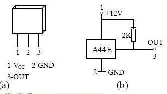 圖11是A44E集成霍耳開關,A44E集成霍耳開關由穩壓器A、霍耳電勢發生器(即硅霍耳片)(mT)、差分放大器C、施密特觸發器D和OC門輸出E五個基本部分組成,如圖12(a)所示。(1)、(2)、(3)代表集成霍耳開關的三個引出端點。在輸入端輸入電壓VCC,經穩壓器穩壓后加在霍耳電勢發生器的兩端,根據霍耳效應原理,當霍耳片處在磁場中時,在垂直于磁場的方向通以電流,則與這二者相垂直的方向上將會產生霍耳電勢差HV輸出,該HV信號經放大器放大后送至施密特觸發器整形,使其成為方波輸送到OC門輸出。
