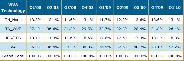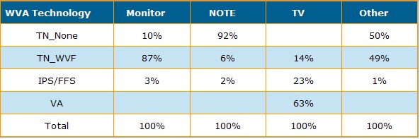 下表則表示了2010年第一季在不同的應用方面各種不同的視角技術的比重?;旧显贜otebook 以及LCD Monitor的面板只有相當少的比重采取了高階的IPS或VA的技術,而在LCD TV的部份,VA型的出貨面積高達60%。