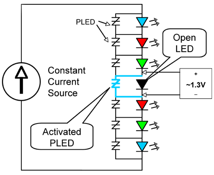 PLED設計是一種電壓觸髮型電子分路裝置,當某個LED出現開路故障時,該裝置能夠提供電流旁路。當某個LED故障時,該設計可避免整個LED燈串都無法正常工作的情況。