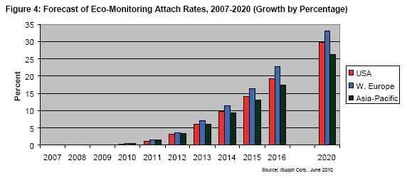 上述每類應用的汽車配售率預計都會增長,2010-2013年增長比較緩慢,隨后從2014年開始基本以兩位數的速度增長,直到2020年末。iSuppli公司的圖表顯示,節能監測和節能建議近期將大幅增長,而由于復雜性和需要與其它汽車系統整合,節能動力總成的布署比較緩慢。但到2020年,美國和西歐的節能動力總成應用將達到35%的配售率,接近節能監測和節能建議系統的水平。