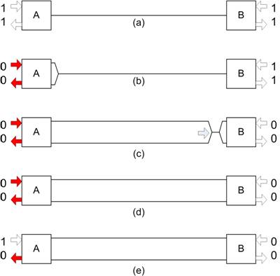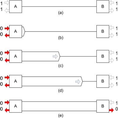 我們的下一種情況(圖2)假設,節點A再次發起一條消息,但是節點B在稍后發起的一條消息具有更高的優先級。如前所述,這種情況以兩個節點均處在非占用模式作為開始,如(2a所示,隨后節點A變為占用(如(2b)所示)發起一條消息。該占用差動電壓再次沿線纜傳輸。在信號到達B處的收發器以前,該節點剛好利用如(2c)所示占用位發起一條消息。這時,兩個節點都正傳輸一個占用位,并且兩個節點都正接收一個占用位(如(2d)所示),然后兩個節點都沒意識到另一個節點也已啟用。由于在我們的假設情況中,節點A具有比節點B更低的優先級,因此有時節點A會通過將其TXD設置為0(如(2e)所示)來發出一個非占用位。但是,由于節點B的作用,RXD會感應到總線仍然處在占用狀態下。