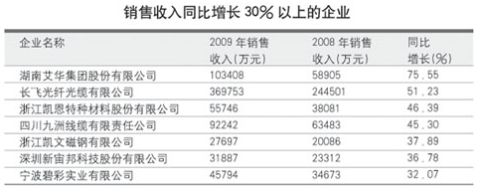 由于2009年受到國際金融危機的打擊,許多元件百強企業的生產經營受到極大影響。僅有35家企業的銷售收入增長超過10%,比上屆的41家還少,更遠低于第21屆時的65家。僅有湖南艾華集團股份有限公司、長飛光纖光纜有限公司兩家企業的2009年銷售收入同比增幅超過50%,分別增長了75.55%和51.23%。而上一屆,銷售收入同比增幅超過50%的企業有7家。值得一提的是四川九洲線纜有限責任公司,2008年的銷售收入增長110.16%,2009年的銷售收入增長45.30%,兩年間的平均增長率達到74.75%,獲得如此驚人的發展速度十分難得。