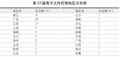 新一屆元件百強的地區分布格局并沒有出現大的變化,100家企業分布在我國20個省、市、自治區。浙江、廣東、江蘇3省仍然是元件百強企業最為集中的地方,企業數分別為31家、29家和12家。長三角地區的江、浙、滬3省市以47席幾乎占據元件百強企業的半壁江山。