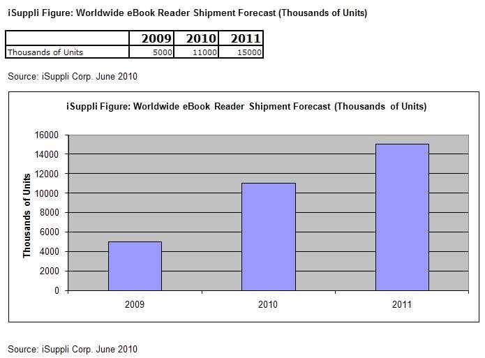 短期內(nèi),當(dāng)電子書閱讀器的價格壓低到iPad起始價格點(diǎn)的一半左右時,可能會吸引消費(fèi)者購買電子書閱讀器。不過,長期來看,電子書閱讀器仍可能有著比最初預(yù)期的更多利基。iSuppli預(yù)測,全球電子書閱讀器出貨量在2010年將達(dá)1,100萬部,2011年還可望成長120%,達(dá)到1,500萬部。