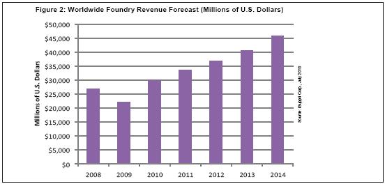到2014年,總體純晶圓代工產業的營業收入將從2008年的268億美元上升到459億美元,復合年度增長率為9.4%。