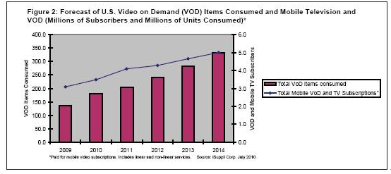 2010年美國移動視頻點播(VOD)和移動電視活躍用戶預計增長到350萬個,2009年是310萬個。隨后幾年用戶數量預計繼續增長,到2014年達到500萬個。