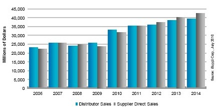 iSuppli公司估計,2009年中國的半導體銷售額中,有52%是通過分銷渠道實現(xiàn)的,相當于257億美元。2009年分銷商銷售額比2008年增長7.6%,而原廠直銷額則下降了4.6%,一個主要原因是一些主要采取直銷方式的領(lǐng)先供應商在2009年銷售額下降。但在未來五年,半導體原廠在中國將提高直銷比例。