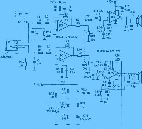 IC1及周圍元件組成緩沖放大級,電路增益=R4/(R1+R2)=50/(10+0.1)≈5倍。為了避免在電腦關機后,在聲卡停止工作時,前置放大器輸入端懸空,處于高阻抗輸入狀態,將感應到的50Hz交流電信號送到后級電路放大,從而在揚聲器中出現較強的噪聲,特設置了22kΩ電阻R25、R26,這樣不但可以將輸入阻抗限制在22kΩ,避免前置電路工作在高阻抗狀態,還可以對50Hz感應信號進行有效的抑制,提高整機信噪比。