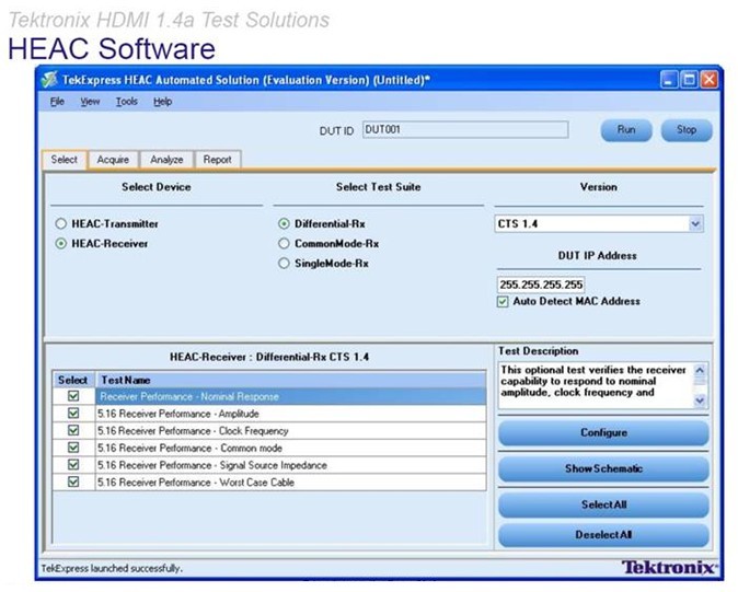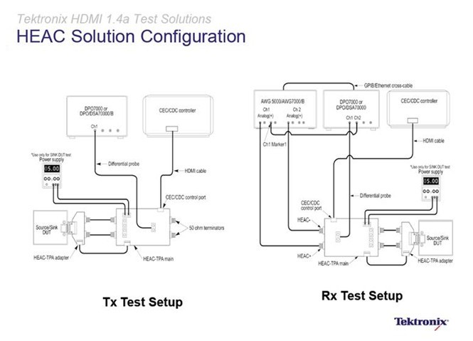 泰克的測試解決方案不僅Type D(移動HDMI)和Type E(車用HDMI)新興應用通吃之外(無需硬件仿真器,并且相關夾具產品都通過了CTS1.4的批準),而且還能實現(xiàn)驗證HDMI 以太網和音頻回傳通道(HEAC) 、3D HDMI強制格式、4K x 2K 和新的色彩空間格式。HEAC的物理層測試包括以太網發(fā)送、接收測試;音頻發(fā)送、接收測試;以及設備阻抗測試和線纜測試。同樣是通過軟硬件結合進行模擬的方法使得用戶無需投資購買更多測試儀,只要購買相應夾具,可在原有示波器、信號發(fā)生器的基礎上進行配置,可產生真正的HEAC信號。