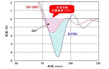 圖2:相比SiFRD(碳化硅快速恢復二極管),SiC-SBD的功率轉換效率大幅提升。(來源:ROHM公司)。