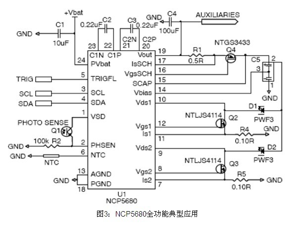 要在弱光下拍得高分辨率照片的數碼相機需要高亮度閃光。雖然白光LED能提供這個等級的光能,但需要比電池所提供的高出近400%的能量。以安森美半導體的NCP5680為例,它配合電池管理及超級電容來驅動LED閃光至充分亮度,提供達10 A的大峰值電流。NCP5680的集成驅動器還可管理超級電容,處理其他峰值功率功能,如變焦、自動對焦、音頻、視頻、無線傳輸、GPS數據讀取及射頻(RF)放大,延長電池使用時間又兼顧纖薄型設計,節省開發時間、電路板空間及元器件成本,見圖3。