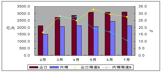 五、內外銷增速差距拉大,出口依存度繼續提高。今年以來,隨著外需不斷回暖,外銷出現持續增長,到7月底,外銷增速已經連續5個月超過30%,并超過內銷增速6.5個百分點。其中,內銷產值14086億元,同比增長23.9%,比上半年回落3.3個百分點,低于產業平均增速3.7個百分點;出口交貨值19752億元,同比增長30.4%,高于產業平均增速2.8個百分點。產業出口依存度(58.4%)比去年同期提高1.3個百分點,比上半年提高0.3個百分點。