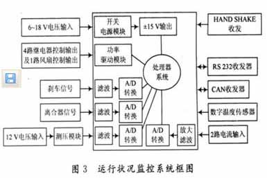 “運行狀況的監控系統”具備采集動力電池的電流、電壓、溫度,以及車輛的剎車信號、離合器壓力信號、行車速度等,準確地獲取這些信號是實現混合動力驅動汽車的關鍵所在。圖3是“運行裝況監控系統”的一個結構框圖。該系統采用兩片TLE4275和一片LM2577作為系統的供電模塊,輸入電壓為6~18V,可滿足車輛啟動和特殊情況下導致的蓄電池輸出電壓不穩定而導致的監控系統癱瘓。