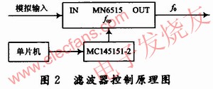 模擬器件的發(fā)展與集成為小型化提供了充分的條件,像松下公司的MN6515,僅為8腳,其帶通濾波器的中心頻率f0可由外加的時鐘頻率fcp控制,其比值fcp/f0約為15.7。只要改變fcp的值,帶通濾波器的中心頻率就會在O~32kHz范圍內(nèi)移動,非常方便,可采用圖2方式進行控制。