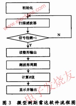 雷達工作時,單片機控制窄帶濾波器不斷的進行掃描,當(dāng)某一個濾波器有信號時,由可重觸發(fā)單穩(wěn)態(tài)電路組成的信號檢測電路輸出由“0”變?yōu)?ldquo;1”,單片機根據(jù)輸出的窄帶濾波器獲得帶內(nèi)頻率,判斷出精度不太高的距離范圍,利用放大整形輸出進行計數(shù)或測量脈沖的周期,獲得足夠精確的頻率值,即為準(zhǔn)確距離。根據(jù)公式計算出R和V送顯示器予以顯示,或通過RS232串口送上一級的計算機系統(tǒng)。