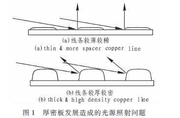 在PCB行業的發展中,目前存在以下3大趨勢,即線條更細、線距更小密度更高、高度差更加明顯。本文使用的厚密板即是該趨勢的集中體現。如圖l(a)是普通光源應用在線距大、厚度小的PCB上的光線路徑。圖1(b)是普通光源應用在線距小、厚度大的PCB上的光線路徑。