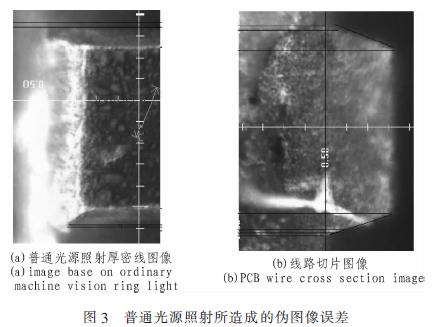 從圖中可以清晰地看到,目前的普通光源攝取的圖像和真實的截面圖有明顯的邊緣偏差,在2X的倍率下,1像素對應的物面尺寸為1.61μm。偽圖像邊緣造成的線寬差別超過3像素。使得系統準確度大為降低。該偽圖像邊緣產生的原因是由于普通光源光線照射角度過小。被厚密線路遮擋大部分光線后,基材和下線寬的亮度和顏色非常接近。而一般的線寬測試中,并沒有將該偏差計入測量結果。致使測量值產生一個固有方向的系統誤差,也就是說,如果該誤差不能被消除,所測得的數據不是真實PCB的線路特征的反映。而該誤差并不能通過改變圖像的清晰程度和對比度消除,只能依據PCB厚密線路的特點去改變光源的設計來消除或減小該誤差。