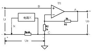 以圖1所示電路為例,U1、R3、R2組成同相放大器,設計期望該放大器能夠將輸入信號Ui放大10倍,Uo是放大器的輸出電壓。由于PCB布局布線受到約束,Ui的“-”輸入端子跟電阻R2的C端之間有一段導線Rpcb。而PCB上可能存在“電路X”引入地回流Ix流過導線電阻Rpcb。受“電路X”地回流Ix的影響,導線Rpcb兩端會有電壓差Ue,為了確定Ue對被測信號的影響,需要測量Ue的大小。