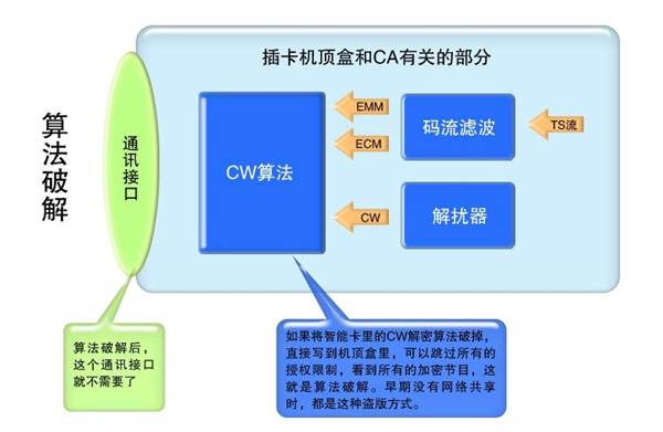 圖六是傳統CA的破解步驟,只要解加密的CW算法被攻破,整個CA就算完了,就可以在此基礎上完成圖二中的算法破解和圖四、圖五中的網絡共享。
