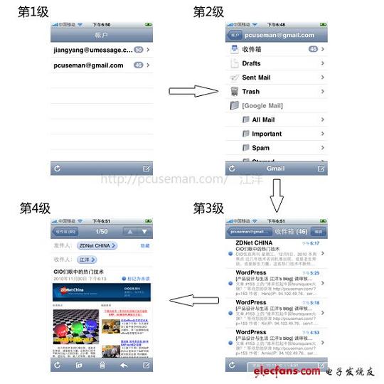 這類應用可以幫助用戶快速完成一個任務,注重內容的組織邏輯功能和信息架構的展現,以方便用戶快速高效的使用,最終完成任務。此類應用一般包含大量的列表及每個列表中的任務功能。最典型的就是系統自帶的“Mail”應用,這是一個非常典型的高效型應用。