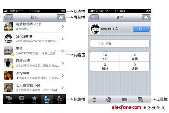 首先iPhone只有一個物理按鍵Home,而這個按鈕主要是在系統級操作上起到一些作用,在一個應用中,絕大多數情況都是退出功能。在480x320這個對手機而言很大的屏幕上要包括以下3個模塊,才能對一個App進行操作。