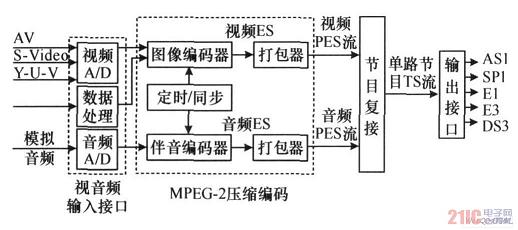 MPEG-2壓縮編碼器是將模擬電視視音頻信號進行MPEG-2壓縮編碼輸出實時TS流的前端設備,適用于數字電視的傳輸或前端信源編碼以及會議電視、遠程教育等各種應用,一臺高級的編碼器不僅具有DVB接口,還應當設有電信接口,以使該設備能方便地在HFC網絡、微波MMDS或8GHZ系統、SDH或PDH等網絡中應用,如圖1所示。