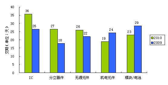 本次調查的結果印證了2010年電子行業所面臨的“缺貨”困境——2010年電子系統制造商與設計公司面臨的最普遍的采購風險是無法供貨,43.6%的公司面臨著供應商無法供貨的困擾。與2009年的調查做對比,2010年IC、分立器件、無源元件、機電元件、模塊/電池五大類物料價格有不同幅度增長,其中IC與分立器件漲幅最大,機電元件、模塊/電池漲幅最小;交貨期方面,IC、分立器件、無源元件交貨期都有所延長,而機電元件、模塊/電池交貨期分別縮短了5天和6天;貨款結算期方面,IC、分立器件貨款結算期均有所延長,無源元件、機電元件、模塊/電池的貨款結算期都縮短了。