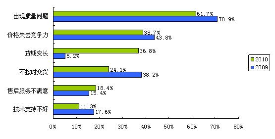在缺貨的大環境下,不少電子系統制造商被迫更換供應商。導致合格供應商降級的最主要因素依次是物料出現質量問題、價格失去競爭力和貨期變長。物料質量問題在任何情況下都是不可妥協的;價格失去競爭力也就是價格上漲壓縮了下游公司的利潤空間;而貨期變長導致供應商降級的比例變化最顯著,由2009年的5.2%大幅上升至2010年的36.8%——這是供應鏈調整的表現。因此,系統廠商在考察新供應商時,除了考察物料質量因素外,產品性價比和供貨能力也是重要的考慮因素。