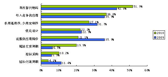 在缺貨漲價的氣氛中談COSTDOWN注定是個艱難的過程。調查中顯示,2010年最主要的COSTDOWN方式是尋找替代物料和引入競爭供應商。與2009年相比,尋找替代物料依然是最重要的COSTDOWN方式,但采取說服供應商降價這種方式的人少了許多,由35.9%降至21.1%,其中,2億營業額以上的大公司在砍價方面顯然更有話語權。