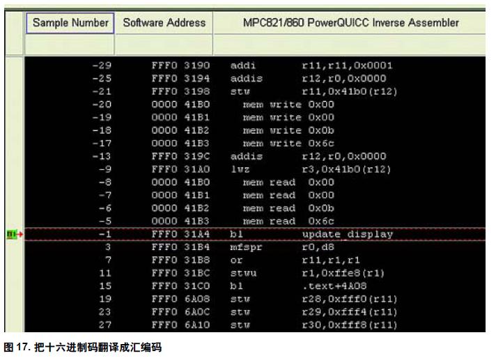 在使用處理器時,特定的十六進制字符包含一個處理器指令。如果您很熟悉十六進制代碼,就能查看這些類似圖13 所示的十六進制代碼表,并知道它們代表的指令。但我們大部分人做不到這一點。因此,絕大多數(shù)分析儀制造商設(shè)計了稱為反匯編器的軟件包。這些軟件包把十六進制代碼轉(zhuǎn)換成易于閱讀的匯編碼。例如圖13中有0000 41B0 和0000 41B1。我們可以從MotorolaPowerQUICC 手冊中查到它們代表存儲器寫0x00 指令。反匯編器可以為我們做這些事情,使我們不需要查找這些代碼。請查看圖17 并注意它們之間的差別。