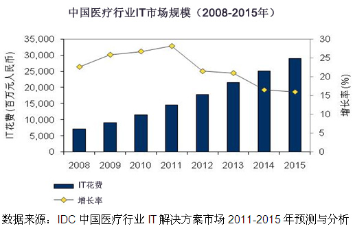 區域醫療信息平臺建設已逐步成為醫療信息化發展的引擎,醫療信息化市場繼續高速增長。根據IDC最近發布的報告《中國醫療行業IT解決方案市場2011-2015年預測與分析》,2010年醫療行業IT花費是114.1億元人民幣,較2009增長26.7%;預測到2015年IT花費市場規模達到290.2億元,2010至2015年的年復合增長率為20.5%。在各類醫療解決方案中,區域醫療信息平臺的增長最快,2010-2015年復合增長率達24.7%。