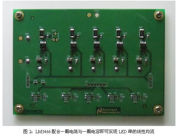工程師僅用一片LM3466、一個電阻及一個電容便能實現現有任一款的AC/DC恒流源基礎上驅動單個LED燈串的基本設計,而通過并聯各LED燈串便能完成一個完整的燈具設計,可簡化街燈等大功率大型照明燈具的設計。