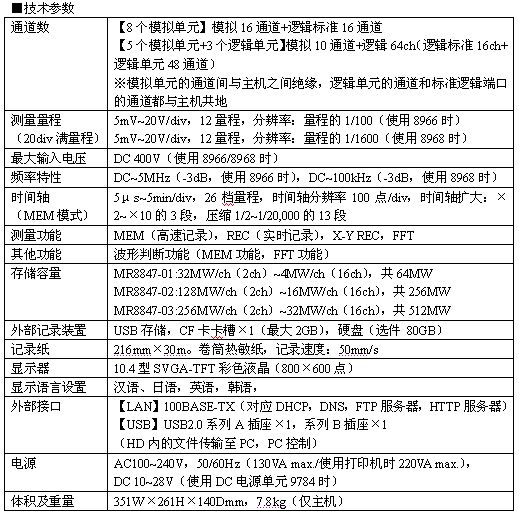 該系列分為:MR8847-01(64MW內(nèi)存);MR8847-02(256MW內(nèi)存);MR8847-03(512MW內(nèi)存)除了原本20MS/s采樣率的靈活運用之外,更新增了波形判斷功能等一系列應(yīng)對市場發(fā)展需要的新功能。