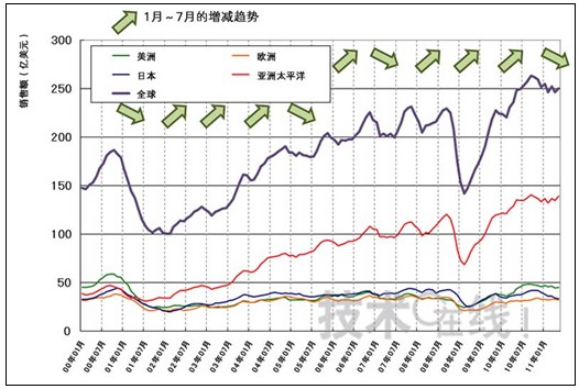 全球及各地區單月半導體銷售額(3個月的移動平均值)走勢(數據由SIA及WSTS提供)1月~7月的增減趨勢用箭頭標出。