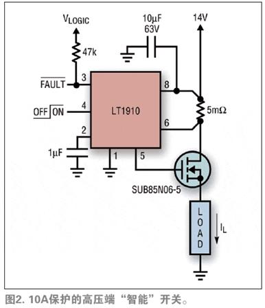 自從功率MOSFET器件推出以來,設計師們一直將它們視作繼電器的潛在替代產品。現代N-MOSFET開關的導通電阻值在一位數毫歐姆范圍內,允許使用沒有笨拙散熱結構的標準表面貼裝技術。目前已經開發出了低價集成電路解決方案,這種方案可提供自含式升壓柵極驅動功能。這些電路還采用了快速故障保護機制,這樣MOSFET就永遠不會有出現故障的風險。凌力爾特公司的LT1910就是這樣的“智能開關”控制集成電路,該器件利用低阻值高壓端電流檢測電阻(類似圖1(c))檢測電路過載,并在發生損害之前關斷正在工作的MOSFET。該集成電路一檢測到過載情況,就設置一個警告標記,并周期性地嘗試重新啟動該負載,直到故障清除為止。盡管這個集成電路本質上只是二進制,但是就用電流檢測形成如圖2所示的堅固“閉環”電子繼電器解決方案而言,這是一個不錯的實例。
