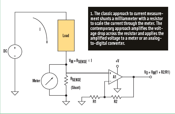 圖1:通過電路進(jìn)行電流測量的最常用方法是測量一個低值電阻兩端的電壓降。