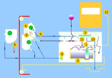 其工藝過程如圖3所示,泵①抽取液槽②的液體或水,通過過濾器③輸送到噴盤架⑤上各種噴盤④中;當平幅運行的織物⑥通過時,液體便噴射其上;末被噴射到織物上的液體則通過回流管⑦流回到液槽;通過預過濾器⑧清除回流液體中的雜質;清洗裝置⑨⑩⑾保證了供液體單元的清洗,控制單元⑿控制整個裝置。