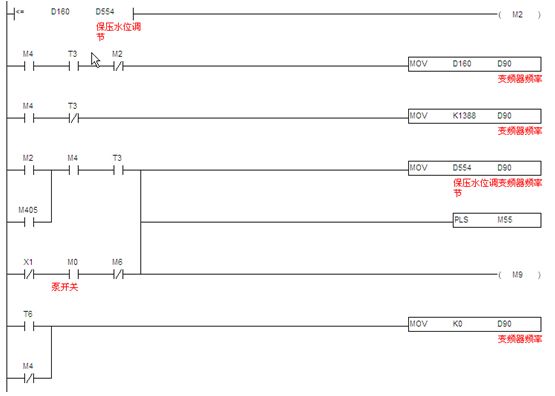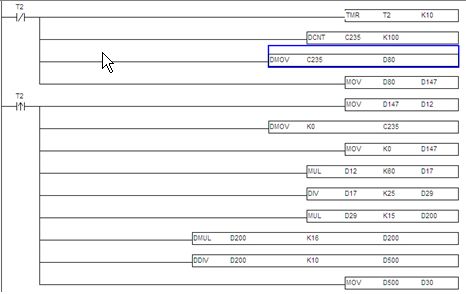 3.2.1測速程序:此部分程序原理就是采用PLC內置的高速計算功能,計算單位時間內從測速編碼器過來的脈沖數,然后根據相關機械系數折算成線速度,這個值作為計算供水泵頻率的一個系數,然后根據濕度設定值,計算出實際所需的供水頻率。見圖8。